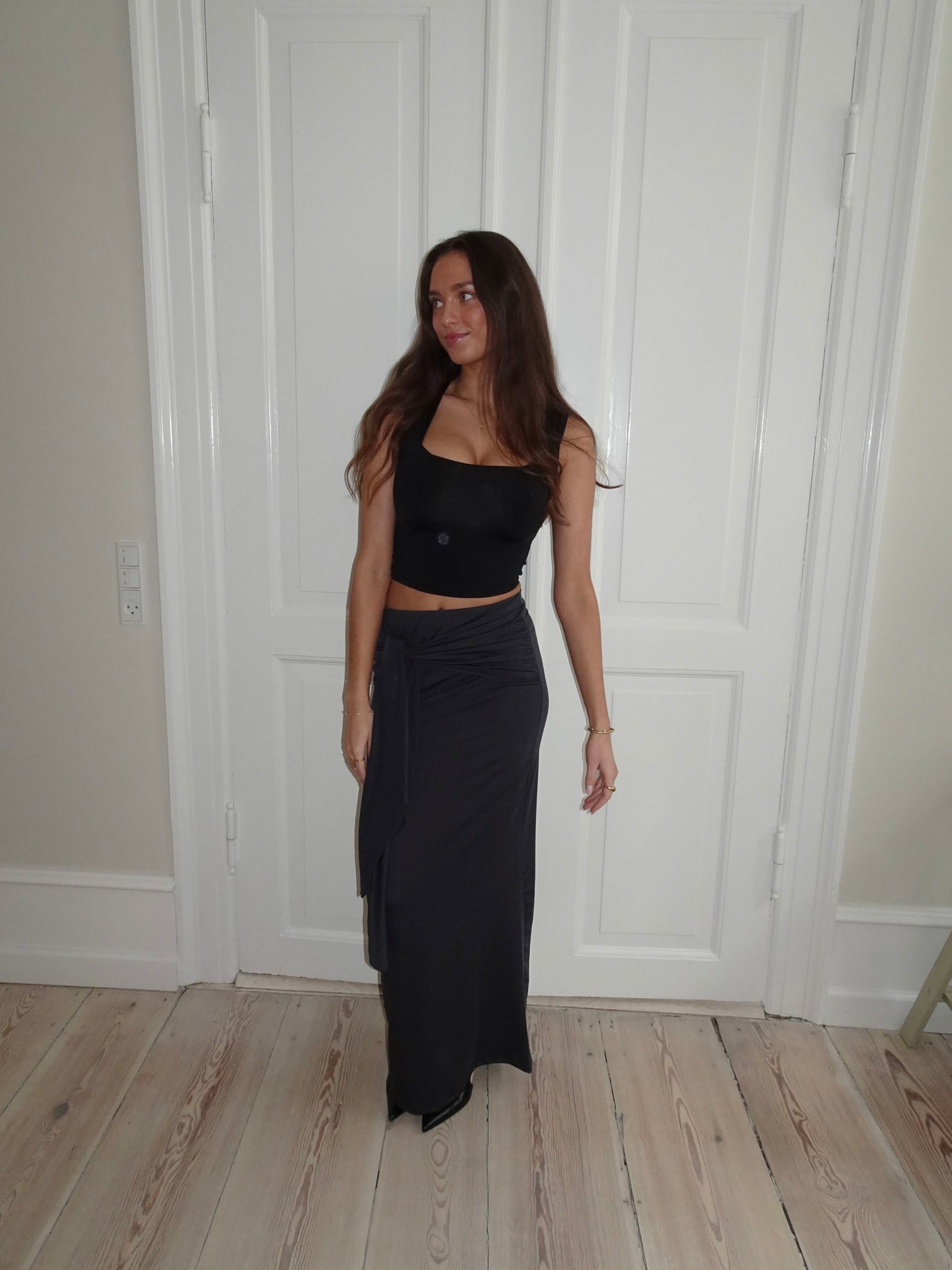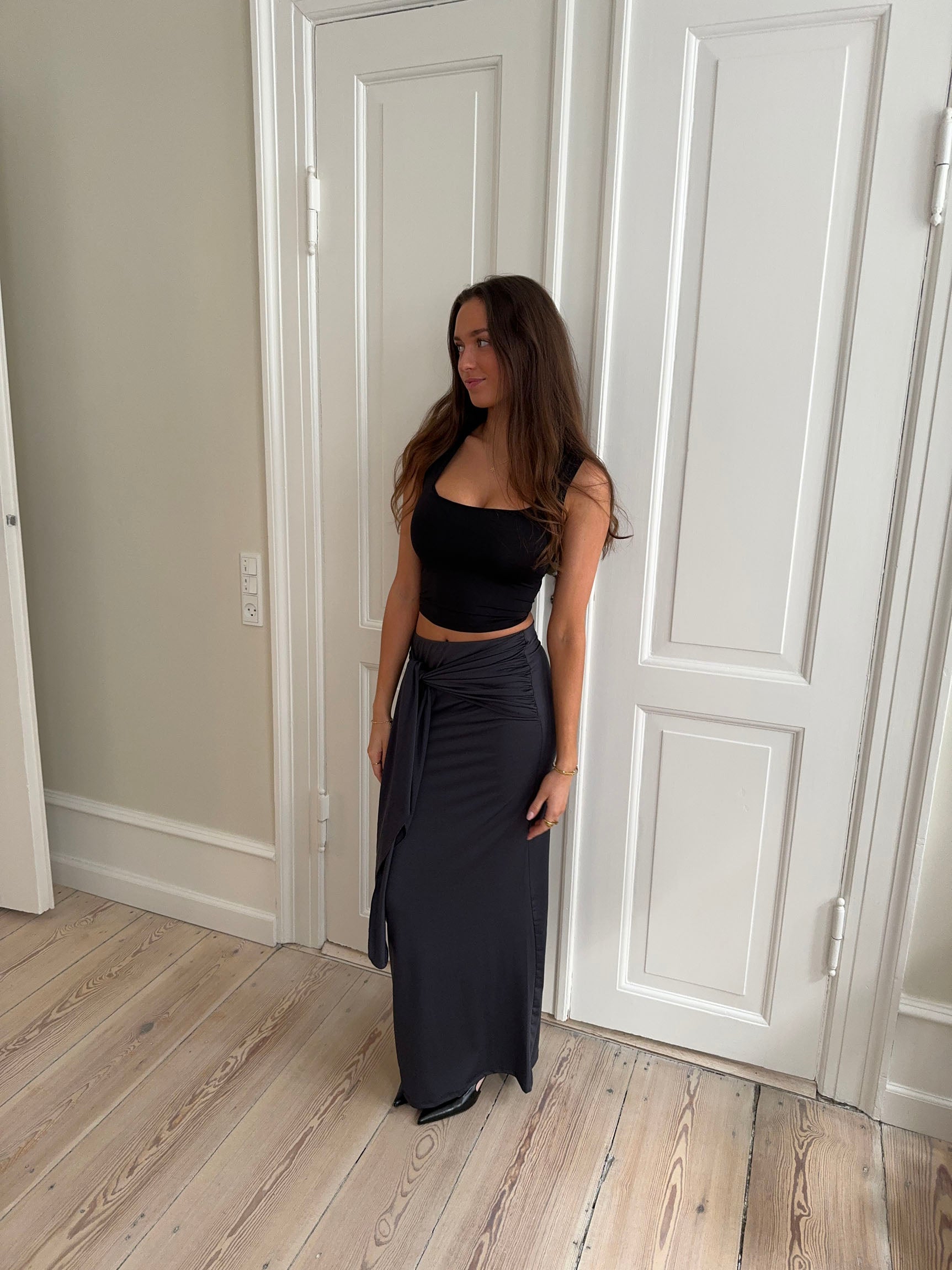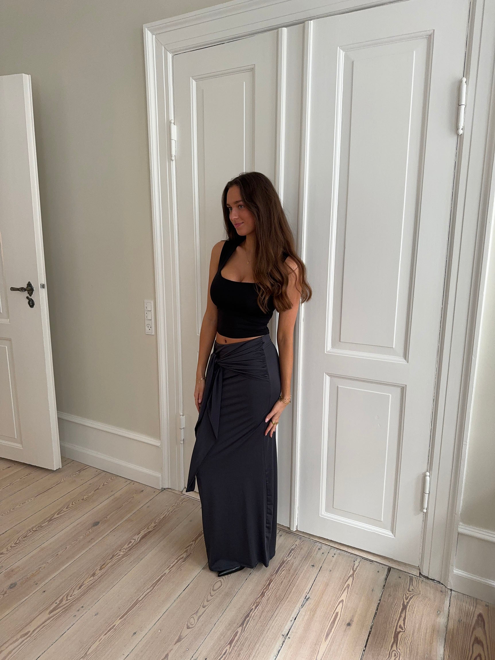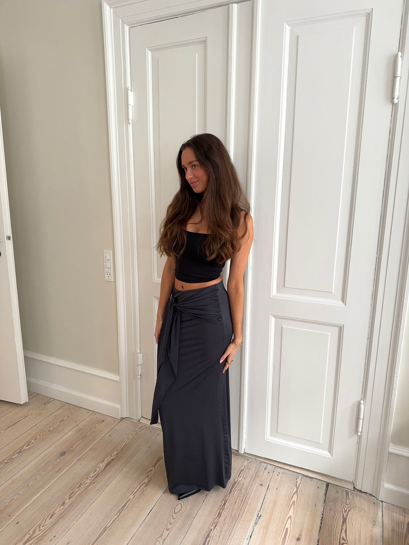 A sleek and elegant maxi skirt in a beautiful gray shade. The form-fitting cut enhances your silhouette, while the large front-tied bands add a unique and sophisticated touch. Perfect for both everyday wear and more formal occasions—style it with a fitted top and heels for a chic and modern look.