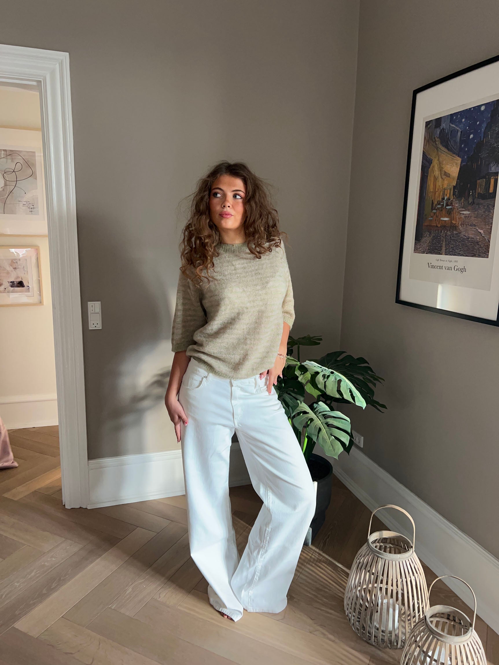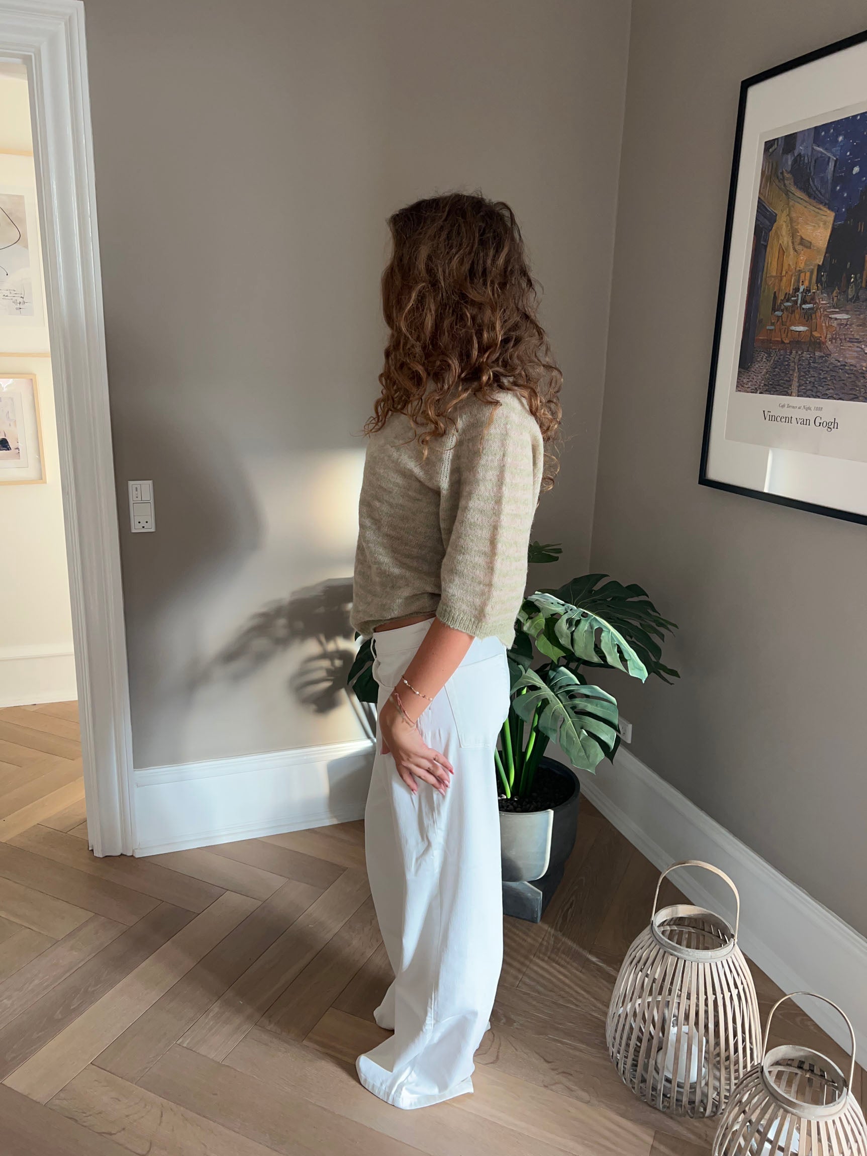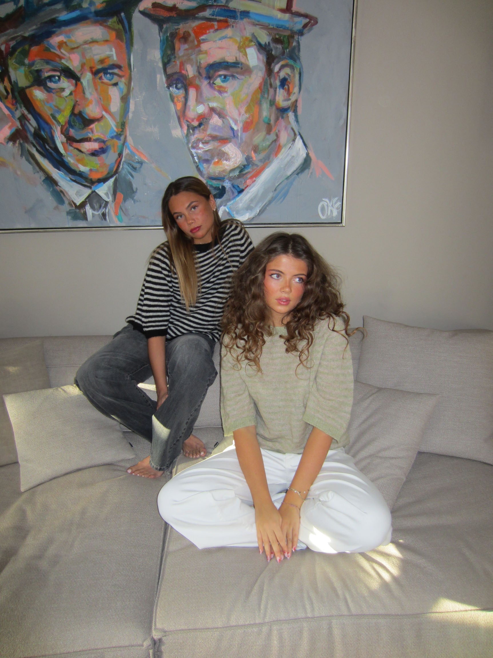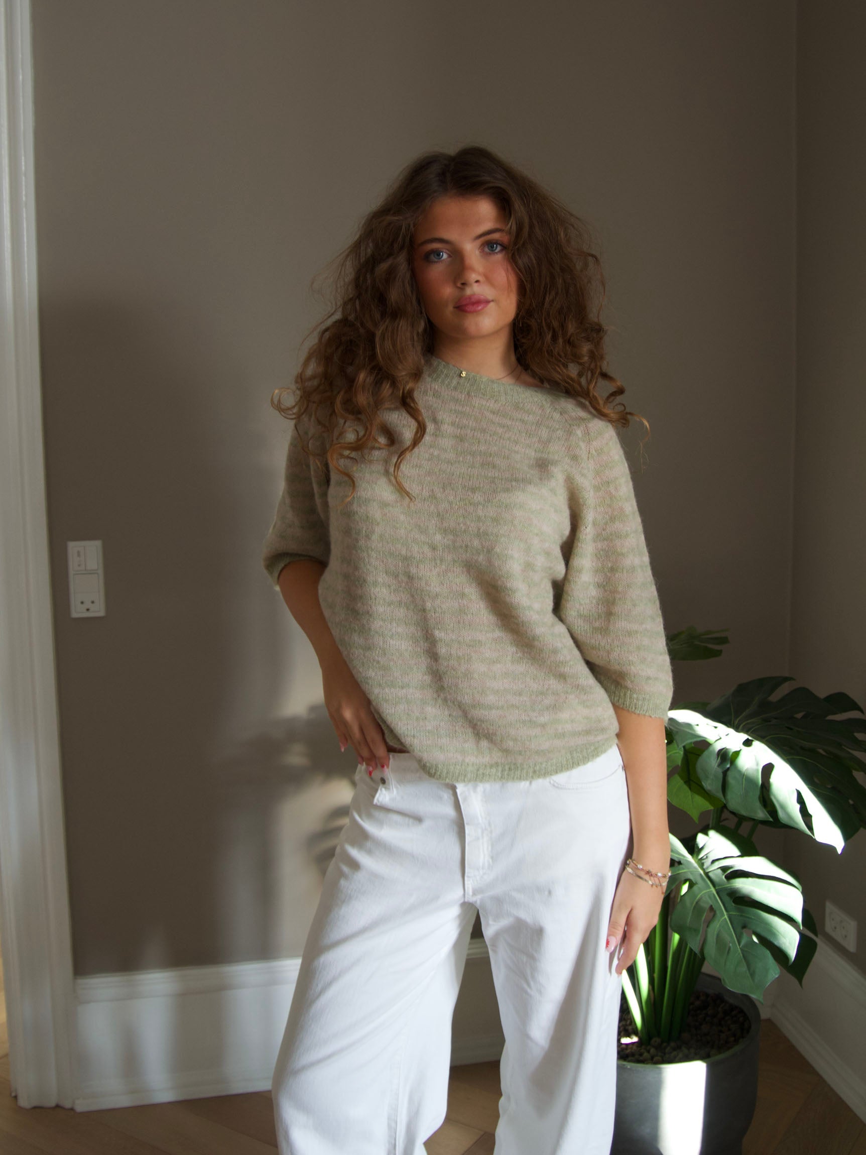 This striped knitted t-shirt has a relaxed, oversized fit, creating a cool and comfortable look. The lightweight knit fabric makes it both comfortable to wear and perfect for layering. The classic stripes add a timeless element, making it suitable for both everyday wear and more casual weekend looks. A perfect balance of style and comfort.